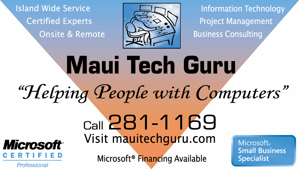Maui Tech Gurus have been servicing business customers with IT services in Maui County since 2005. We have expanded our customer base 'out of state' hence we have changed name, entity, internal systems and procedures to facilitate growth - just like we do for our customers. We aim to serve more businesses in the Pacific rim with more and better IT services. Click to visit Pacific Tech Gurus LLC website.